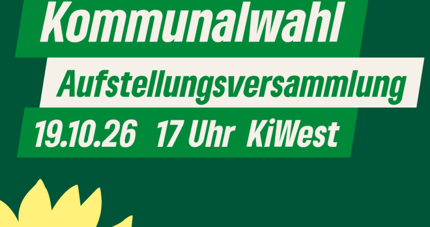 die Weichen für unsere grüne Zukunft in der Kommune stellen wir gemeinsam! Am 19. Oktober 2025 um 17 Uhr findet unsere wichtige Aufstellungsversammlung für die Kommunalwahl 2026 in den Räumen der AWO statt.